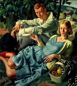 Whatever Fleetwood-Walker’s intent, the two figures look as if they are related and there seems to be something going on below the surface that hints at an “innocent” incest in the same way the relationship between the cousins in Mariana does. And although the painting seems to be the epitome of wholesome sweetness at first glance there is something highly sexual about it as well. There seems to be a hint of Balthus-like perversion and more than a little of Cadmus’ cartoonish sexuality thrown in. The female figure recumbent, lazily offering up her flower with a basket of (perhaps forbidden) fruit. The male figure slightly erect with his muscular but fleshy head thrust forward. They look bored by whatever it is they are watching (other members of the party perhaps) but they also look as if things may have been interrupted just before they got going and are now just biding their time until they are alone again. .