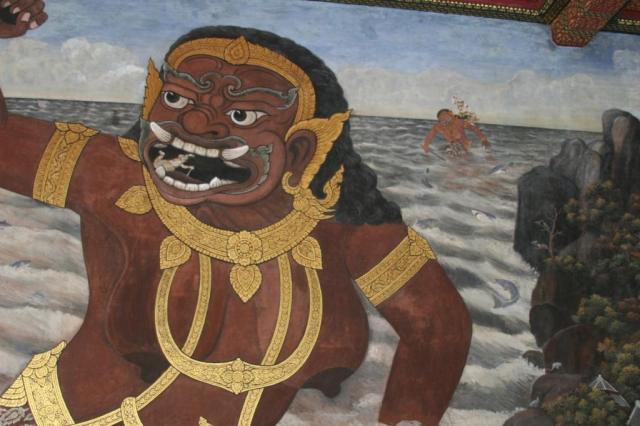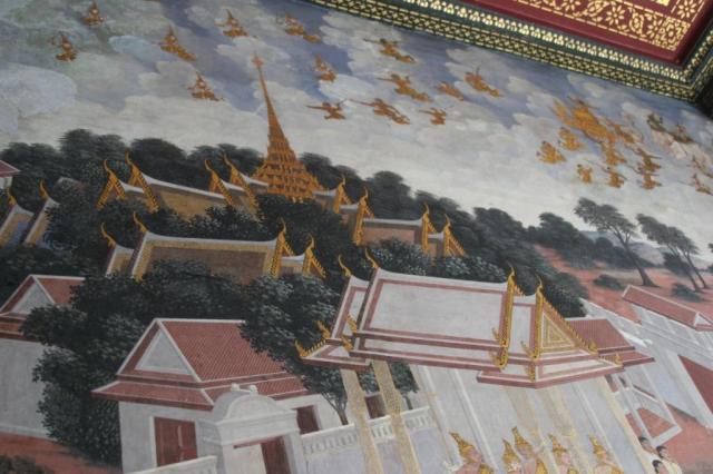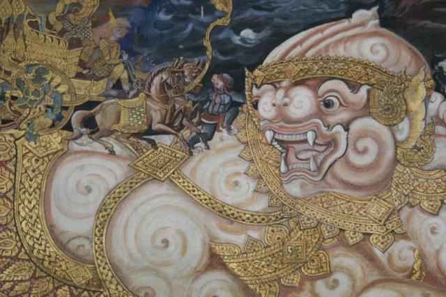 I absolutely fell in love with these murals. The they are on the walls of a cloister-like covered walkway that encloses the the temples of the Royal Monastery at the Grand Palace in Bangkok. They are visually stunning and have so many fascinating scenes and details I could have spent hours looking at them.
