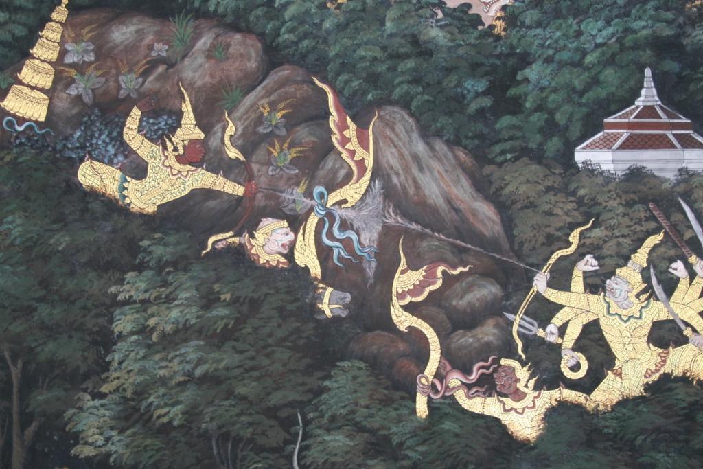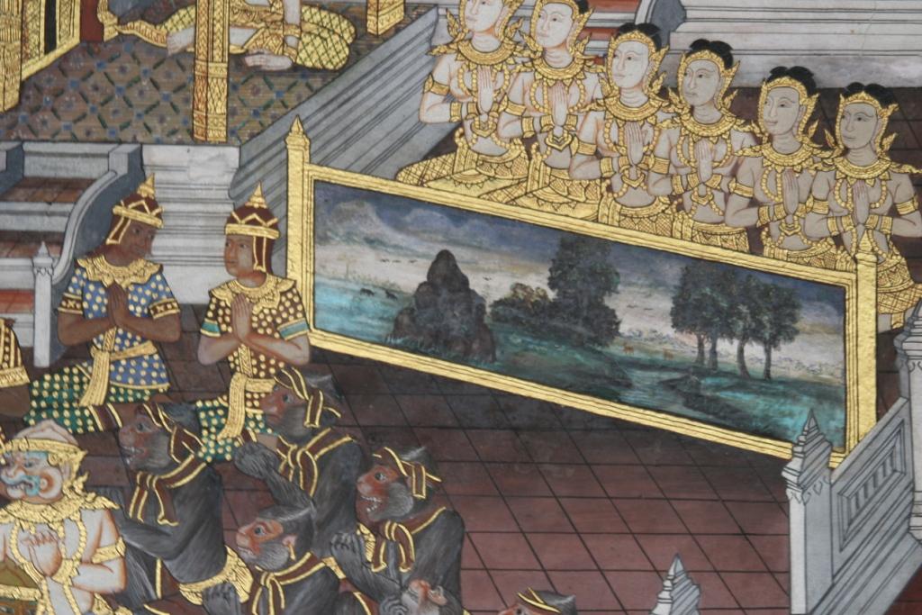 I absolutely fell in love with these murals. The they are on the walls of a cloister-like covered walkway that encloses the the temples of the Royal Monastery at the Grand Palace in Bangkok. They are visually stunning and have so many fascinating scenes and details I could have spent hours looking at them.