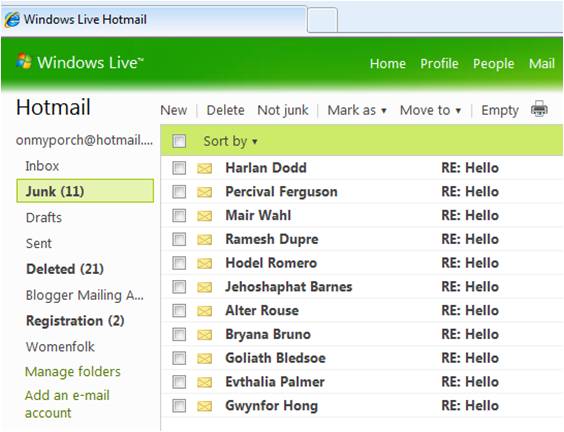 I have no idea who any of these people are, but they sure seem to think that I need help with a particular male problem. (I don’t want to say what it is lest the Spam-bots pick up on the words…) I get at least one of these a day and am always amazed at the creativity of the names. Just now I looked and there was another two, this time from Shug Harp and Felina Farnsworth.