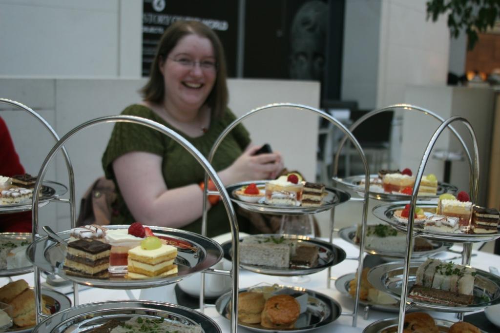 Claire, who has already written about the great elevator fiasco on her blog,as seen through a forest of tea things. We each had one of these to ourselves. The dainties at top look pretty but my real interest was in the scones on the bottom tier.