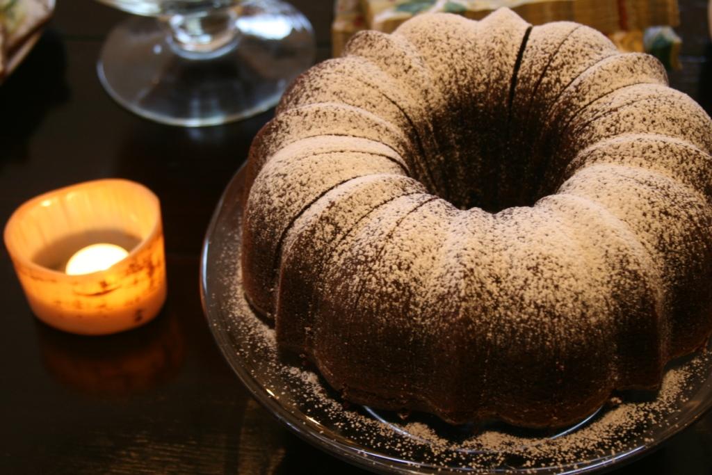 | The chocolate sour cream Bundt cake looks appropriately festive. |