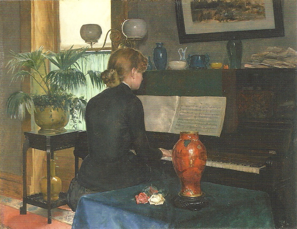 In honor of the last day of Virago Reading Week, I thought I would choose a painting this week that looks like it could be a vintage Virago cover. I think this one fills the bill quite nicely. I don’t think Virago ever has (or will) publish any E. M. Forster titles, but the image image also reminds me of the scene in Forster’s A Room With A View where Lucy Honeychurch is playing piano in the Pension Bertolini in Florence.