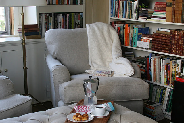 | Do you remember this picture of my library? Well, I faked it. I would never drink espresso. The brown liquid in the cup is soy sauce. |