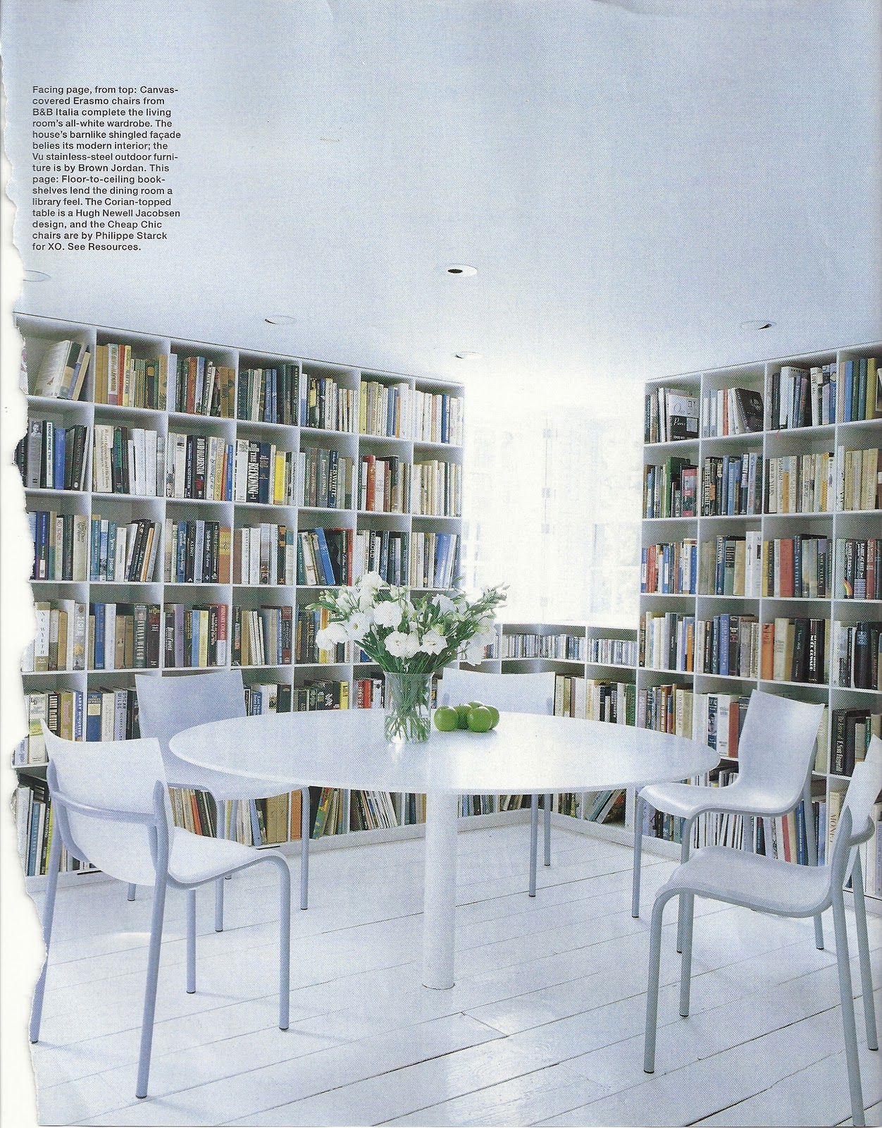 Great bookshelves, but brrrr, what a chilly room! The flowers and apples on the table come across as an afterthought. Could any reading take place here…?