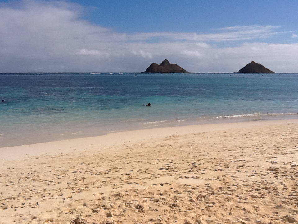I took John back to Lanikai beach which is easily the nicest beach on O’ahu, and because of its location in a residential neighborhood is not subject to tour buses. The sand is fine and soft, the water is always perfect (except on the occasions when Portuguese men o’war are present), and the view is unbeatable. It is on the windward side of the island so it gets more cloud and rain than the Honolulu side of the island, but when the weather is nice Lanikai is the best.