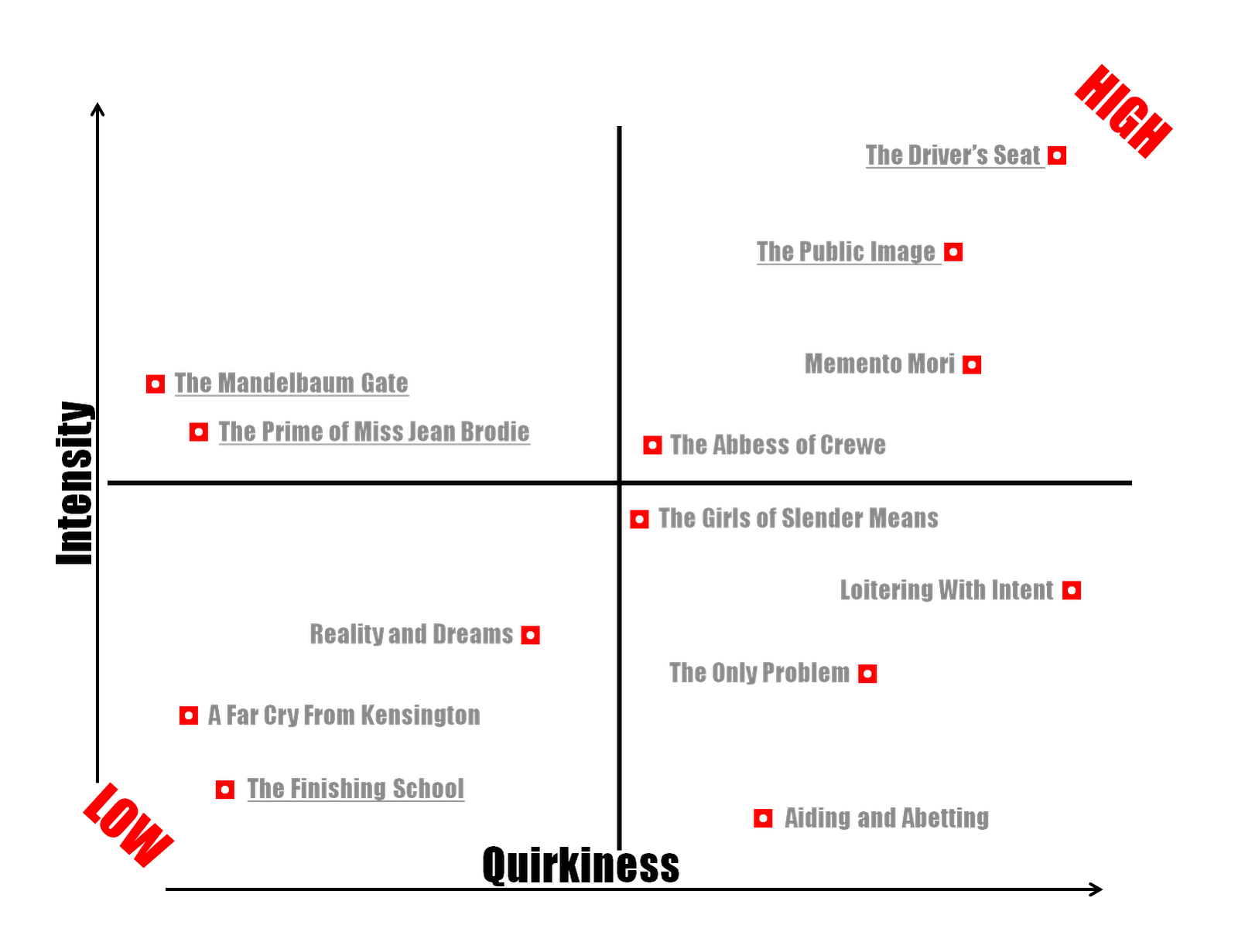 As I thought about the chameleon like quality of Spark’s work, I thought it might be easier to show my thoughts graphically. The graph is not perfect but it comes close to approximating the variation in the thirteen Sparks I have read. Just keep in mind that intensity doesn’t always mean serious.