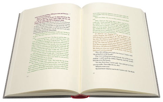 I like the idea of the colored text. The Sound and Fury actually put me off Faulkner for a good many years. I read it in college and it proved to be the bane of my existence. I did much better with As I Lay Dying since it didn't have the stream of consciousness thing going on like in this one.