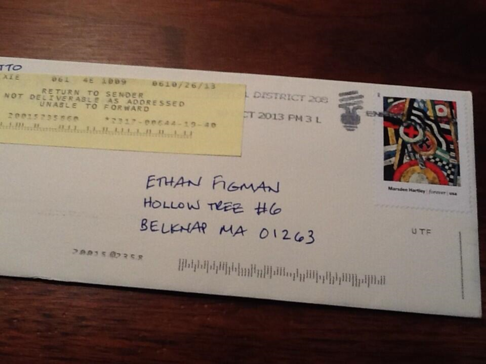 I have been a big fan of Wolitzer since I read The Wife several years ago. In The Interestings we have the story of a group of friends who meet at summer camp in Massachusetts in the 1970s and remain close well into their adult lives, in fact for the rest of their lives. One night when I was reading it one of the characters nostalgically makes up an address for their former summer camp where he can be reached. The thing that struck me was that the address included a zip code. Being a bit of a U.S. Mail nerd I was intrigued that Wolitzer had included a zip code. So, at 1:00 am I found myself writing a letter to the address to see what would happen. Not surprisingly the letter was returned as undeliverable. Unfortunately the days of the postal service stamping the envelope “return to sender” are over. Instead a sticker is affixed to the envelope largely covering the address. Luckily the sticker is removable so I was able to remove it and place it elsewhere on the envelope. After all the only reason I sent the letter was so that I could Tweet a picture of the returned envelope to @MegWolitzer. Happily she retweeted.
