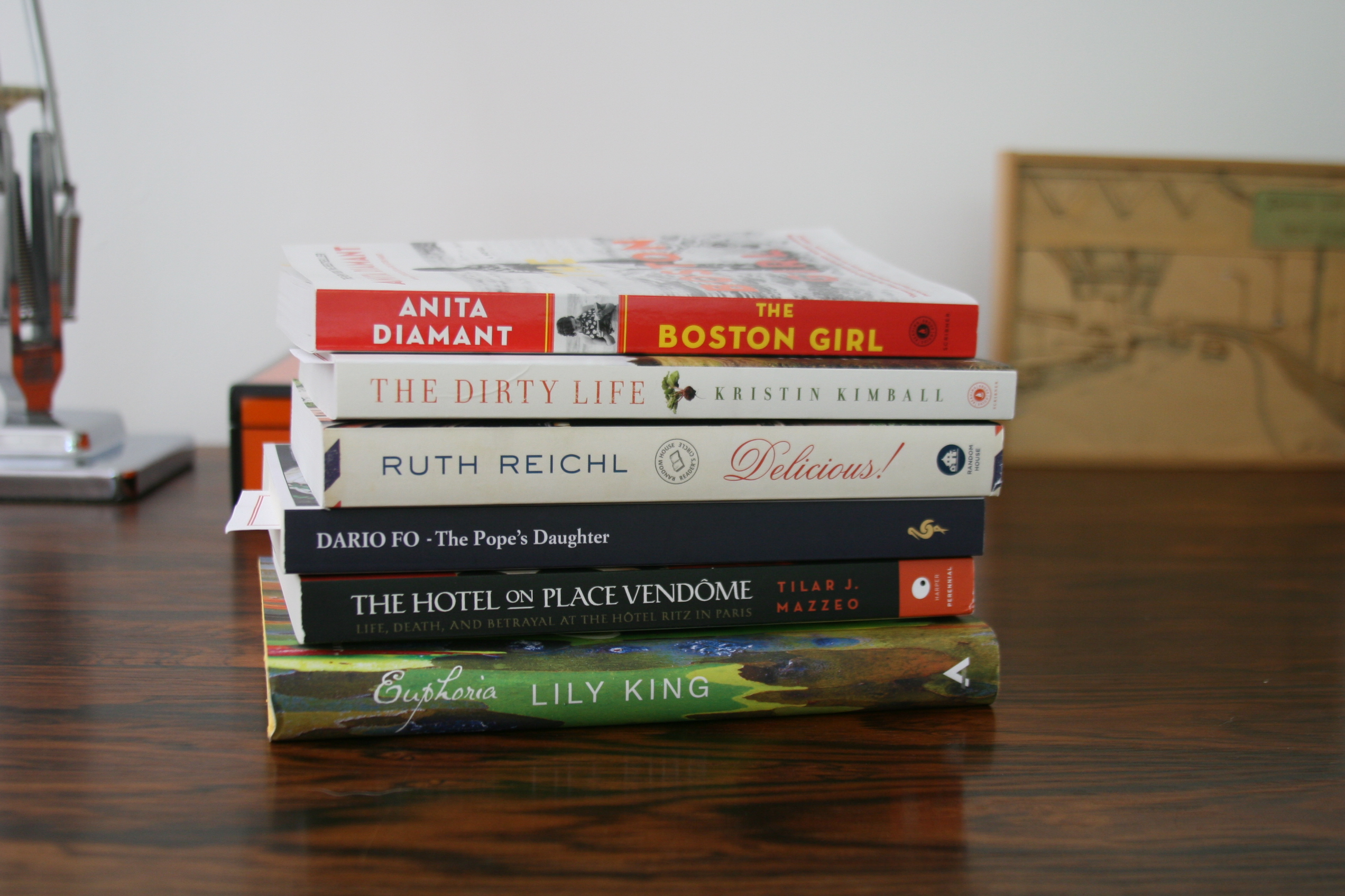 I’ve been avoiding Ruth Reichl’s novel because I love her non-fiction so much I’ve been wary of thinking less of her in case her gift for writing doesn’t transfer to fiction. I guess the time was right to take the plunge. I read some Dario Fo in college Italian classes. Don’t remember anything about him but a combo of the cover and the fact it is a Europa book kind of sealed the deal. The book about the Place Vendome was for John as was the The Dirty Life–a memoir of a woman who decides to become a farmer. I’m not sure why I bought the Anita Diamont same for Euphoria. Probably a cover thing.
