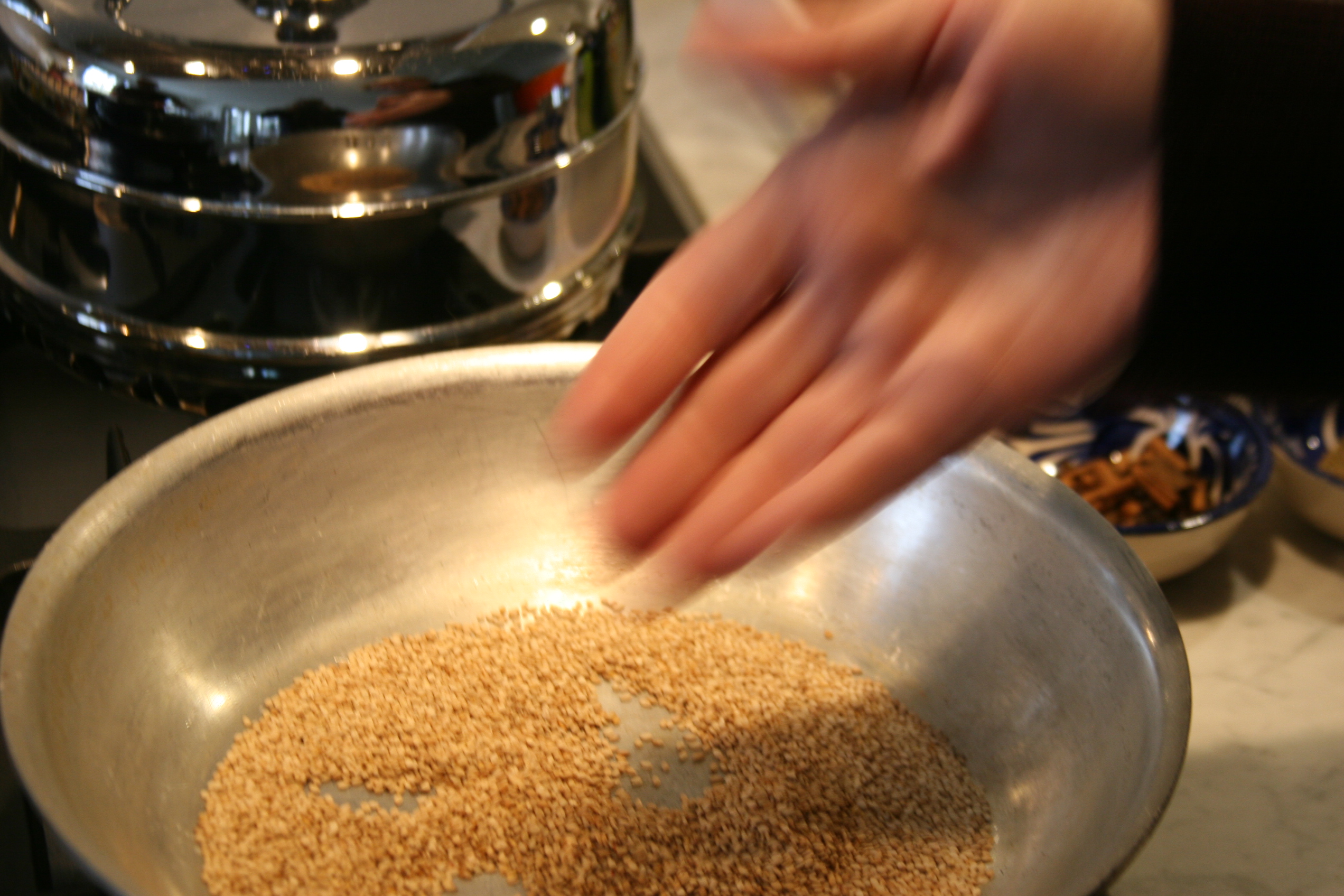 A good mole has at least 20 different ingredients in it. I think the recipe I have has about 25. Finding all of them required a trip to a Hispanic market in Silver Spring.Prep is everything. Getting all the raw ingredients measured and ready to go is a must. Over the next several hours we’ll be toasting, roasting, and frying most everything you see here.Did I mention I had to make stock the day before?Everything appears to be ready.When we learned how to make it in class, the instructor had us taste the sauce after every addition. I wanted John and our friend Sarah to have the same experience so I had them taste it after each step. We even used these little tasting spoons that I bought in the market in SMdA for almost no money.After charring, these will all get liquefied and form the base of the sauce along with the chicken stock.Some things, like sesame seeds get dry toasted.Peppercorn, clove, and cinnamon stick also get dry toasted.Three kinds of dried chiles get toasted before being soaked in water.And then the frying in pork lard begins.This is what raisins look like after being fried in lard. They sure plump up.Plaintains getting golden in the lard.