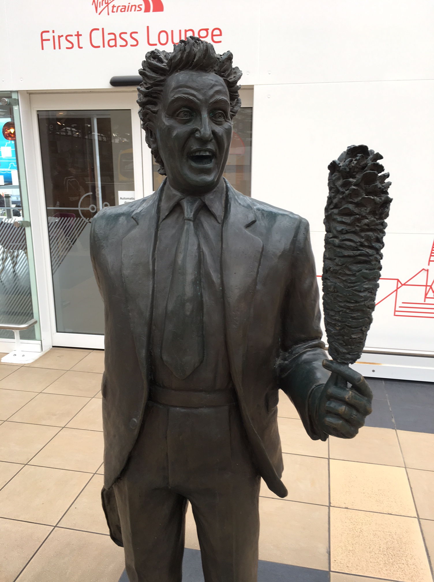 The statue is of SIR KEN DODD who is 90 years old and still performing 3 or 5 hour shows.He is funny by the way.