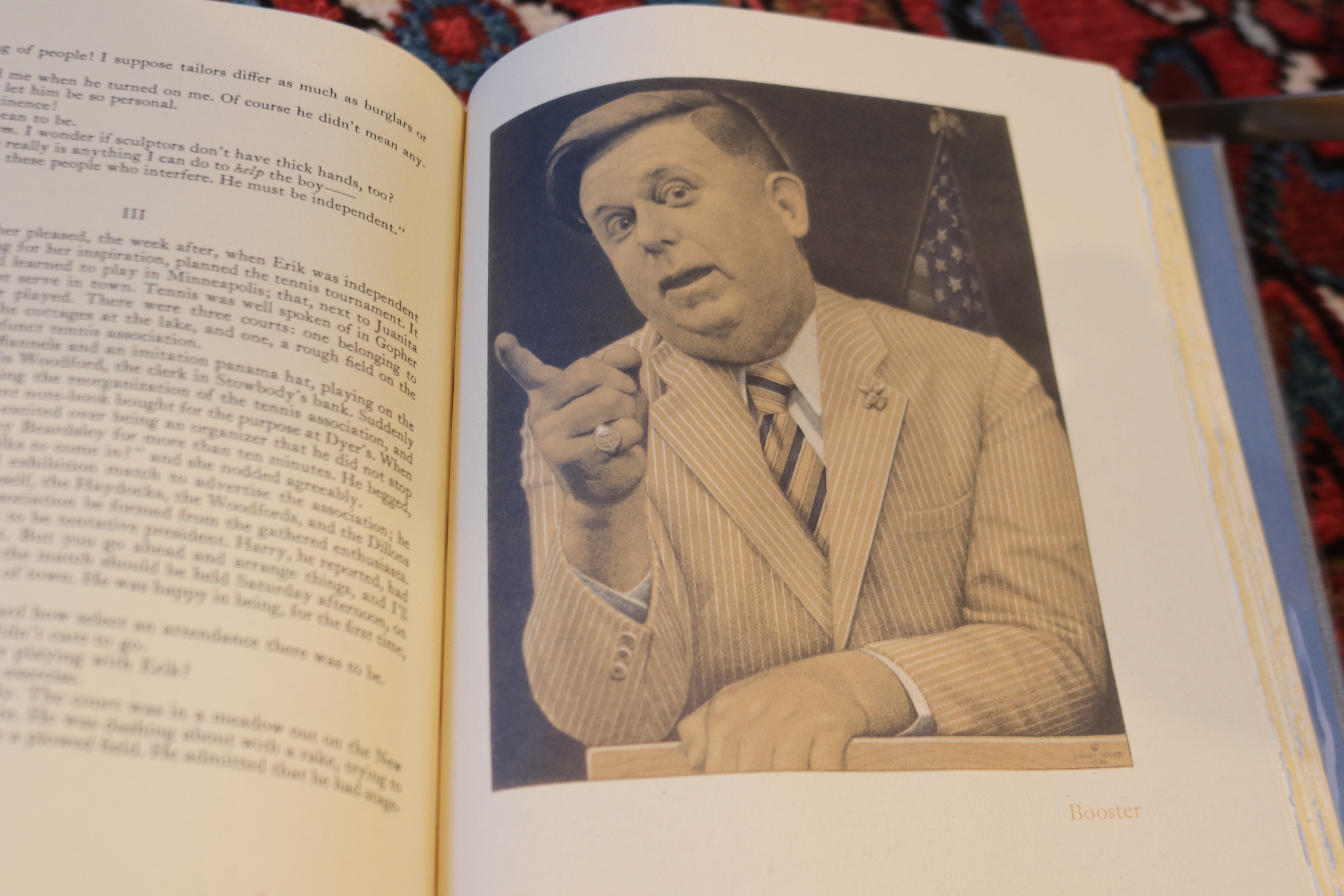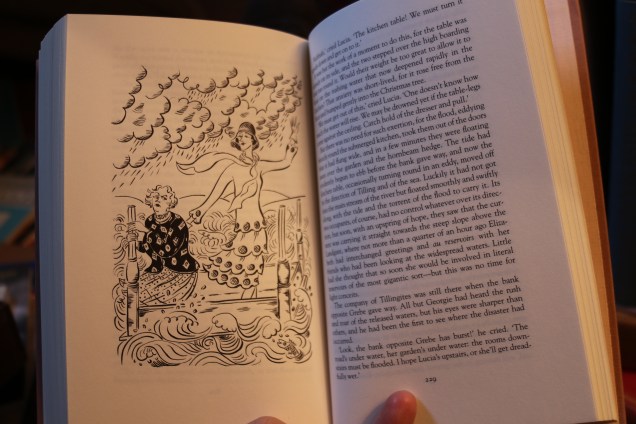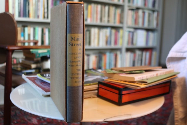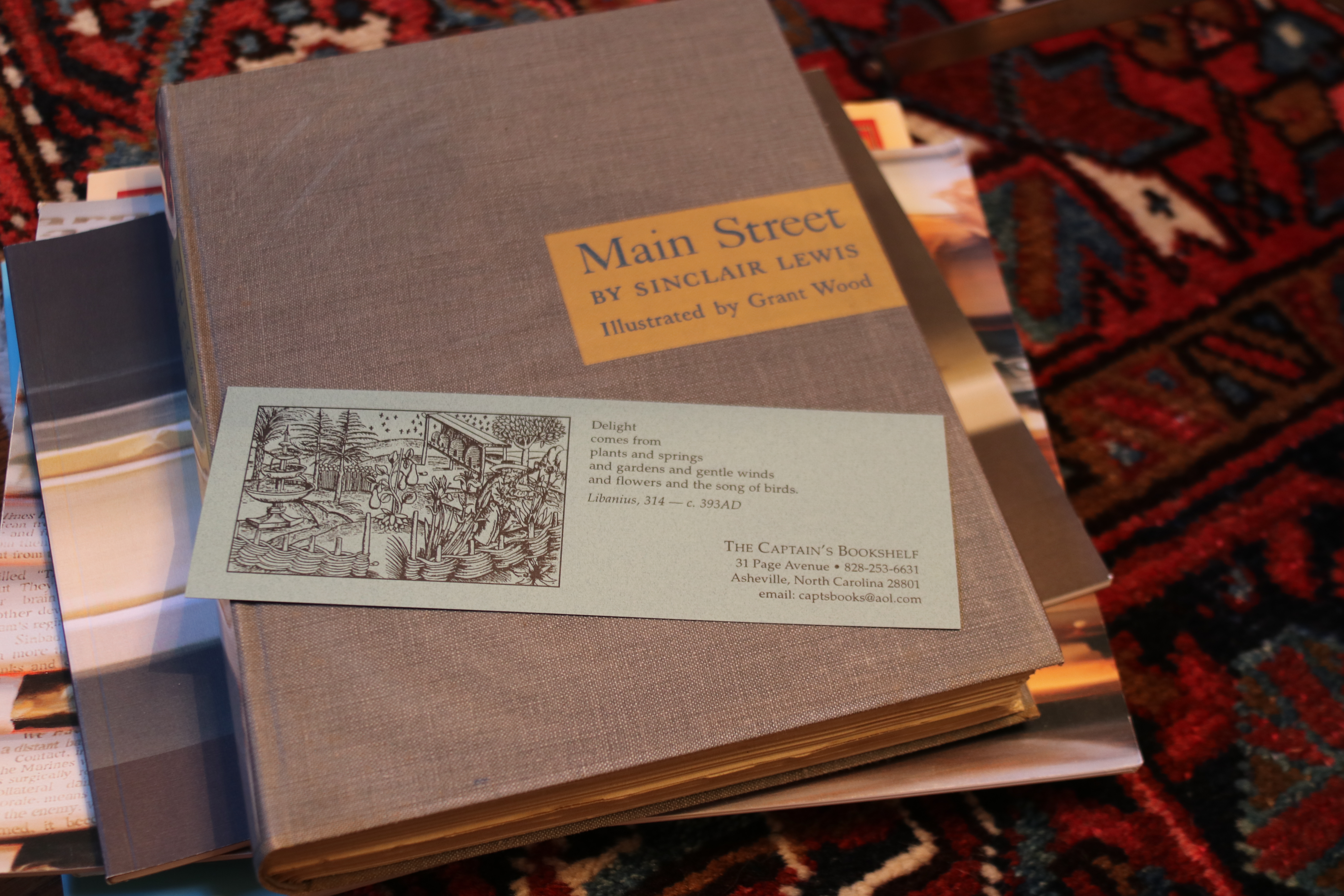 The main theme of this cabinet is really simply overflow. Even though there are some odds and ends in here, many of these books are things I would read, but I simply ran out of room on my shelves. They ended up in here mainly because they were too fine the be reading copies and so did not need to be easily accessible.When I mentioned once that I wanted to find the Mapp and Lucia books in similar editions John ran with that and surprised me at Christmas with this Folio Society boxed set. They are lovely, but they take up a lot of darn room.Mapp (L) and Lucia (R) floating away on flood waters on an upturned kitchen table.And speaking of boxed sets, this Bill Amberg set from Penguin was a special edition from their 75th anniversary, I think. Another gift from John.I’ve had these for about 10 years and only took the shrink wrap off of one of them.Amberg is a leather goods maker and these books are packed in tissue like a fine pair of shoes or handbag.The leather is buttery smooth and the attached luggage tag can also serve as a bookmark.Out of the six books, this was the only one I had never read which is why I took it out of the shrink wrap.A limited edition Main Street illustrated and signed by Grant Wood.I include the bookmark from the bookseller because he went above and beyond. I’ve never been to The Captain’s Bookshelf but John was in there mentioning to the owner the kinds of things I liked. The owner said that he had just the thing, left the shop, went home home, got this book, and brought it back for John to buy.Grant Wood was the artist who painted the famous American Gothic. He captures Lewis’s characters perfectly.Small town Minnesota ‘slum’.