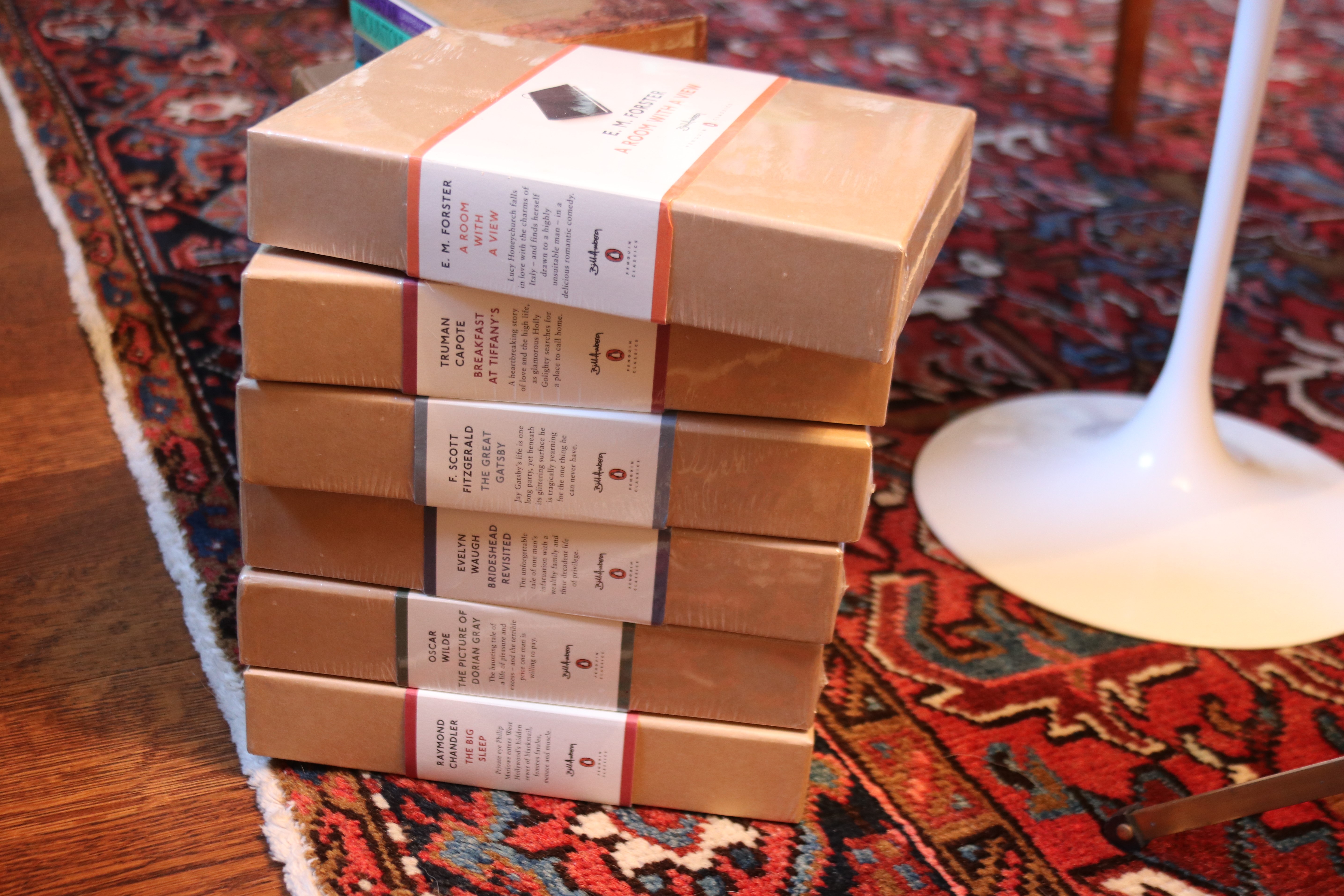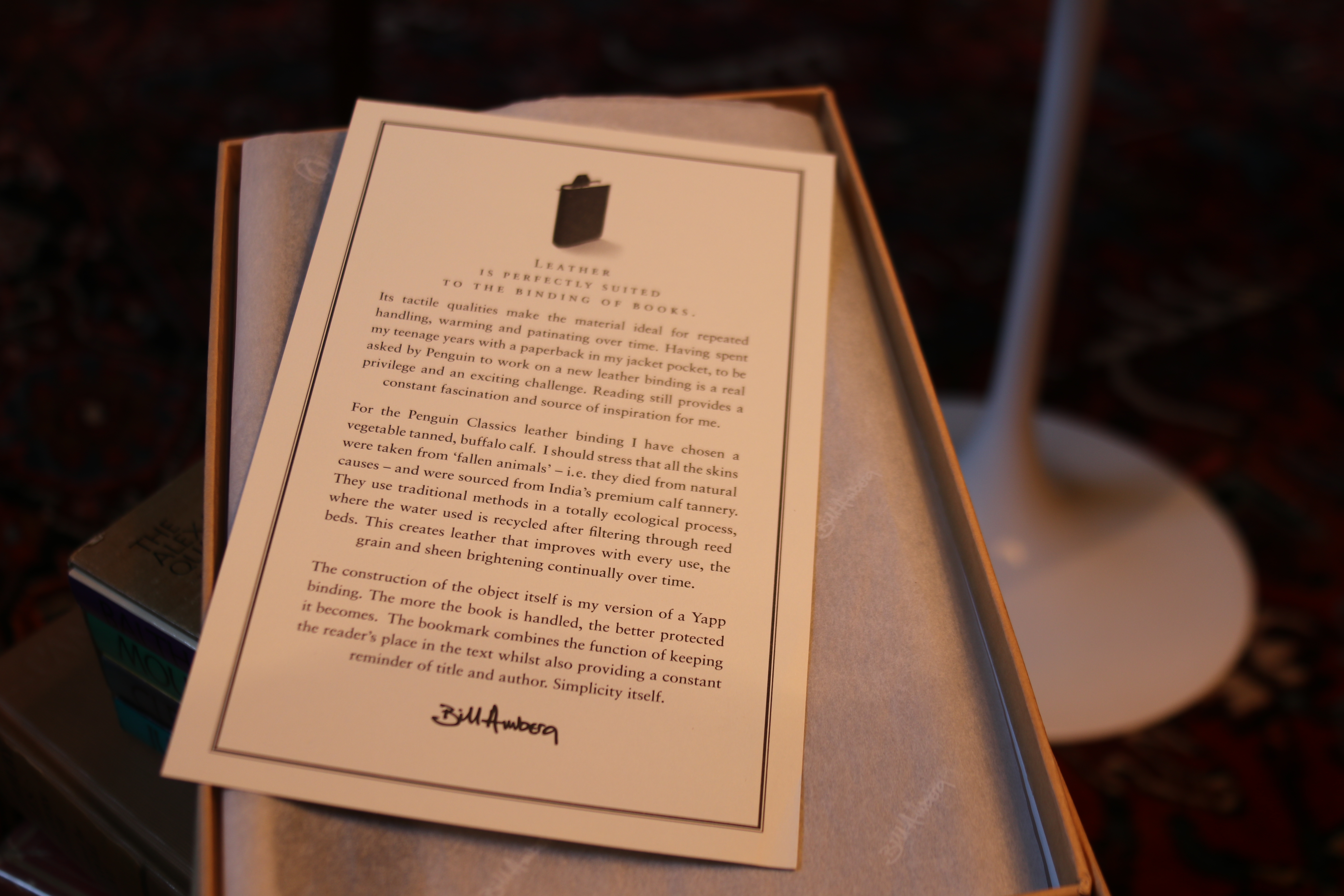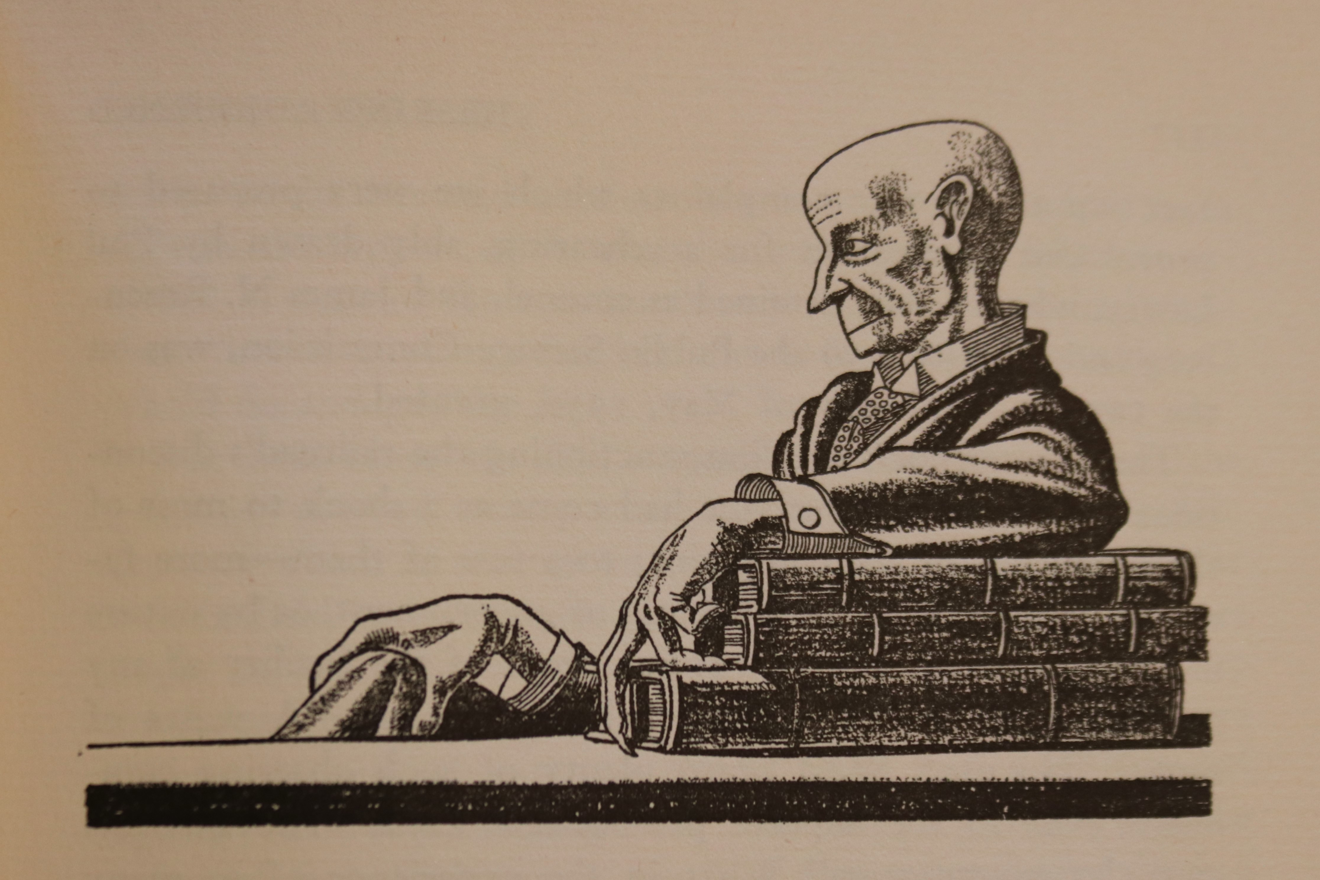 The main theme of this cabinet is really simply overflow. Even though there are some odds and ends in here, many of these books are things I would read, but I simply ran out of room on my shelves. They ended up in here mainly because they were too fine the be reading copies and so did not need to be easily accessible.When I mentioned once that I wanted to find the Mapp and Lucia books in similar editions John ran with that and surprised me at Christmas with this Folio Society boxed set. They are lovely, but they take up a lot of darn room.Mapp (L) and Lucia (R) floating away on flood waters on an upturned kitchen table.And speaking of boxed sets, this Bill Amberg set from Penguin was a special edition from their 75th anniversary, I think. Another gift from John.I’ve had these for about 10 years and only took the shrink wrap off of one of them.Amberg is a leather goods maker and these books are packed in tissue like a fine pair of shoes or handbag.The leather is buttery smooth and the attached luggage tag can also serve as a bookmark.Out of the six books, this was the only one I had never read which is why I took it out of the shrink wrap.A limited edition Main Street illustrated and signed by Grant Wood.I include the bookmark from the bookseller because he went above and beyond. I’ve never been to The Captain’s Bookshelf but John was in there mentioning to the owner the kinds of things I liked. The owner said that he had just the thing, left the shop, went home home, got this book, and brought it back for John to buy.Grant Wood was the artist who painted the famous American Gothic. He captures Lewis’s characters perfectly.Small town Minnesota ‘slum’.