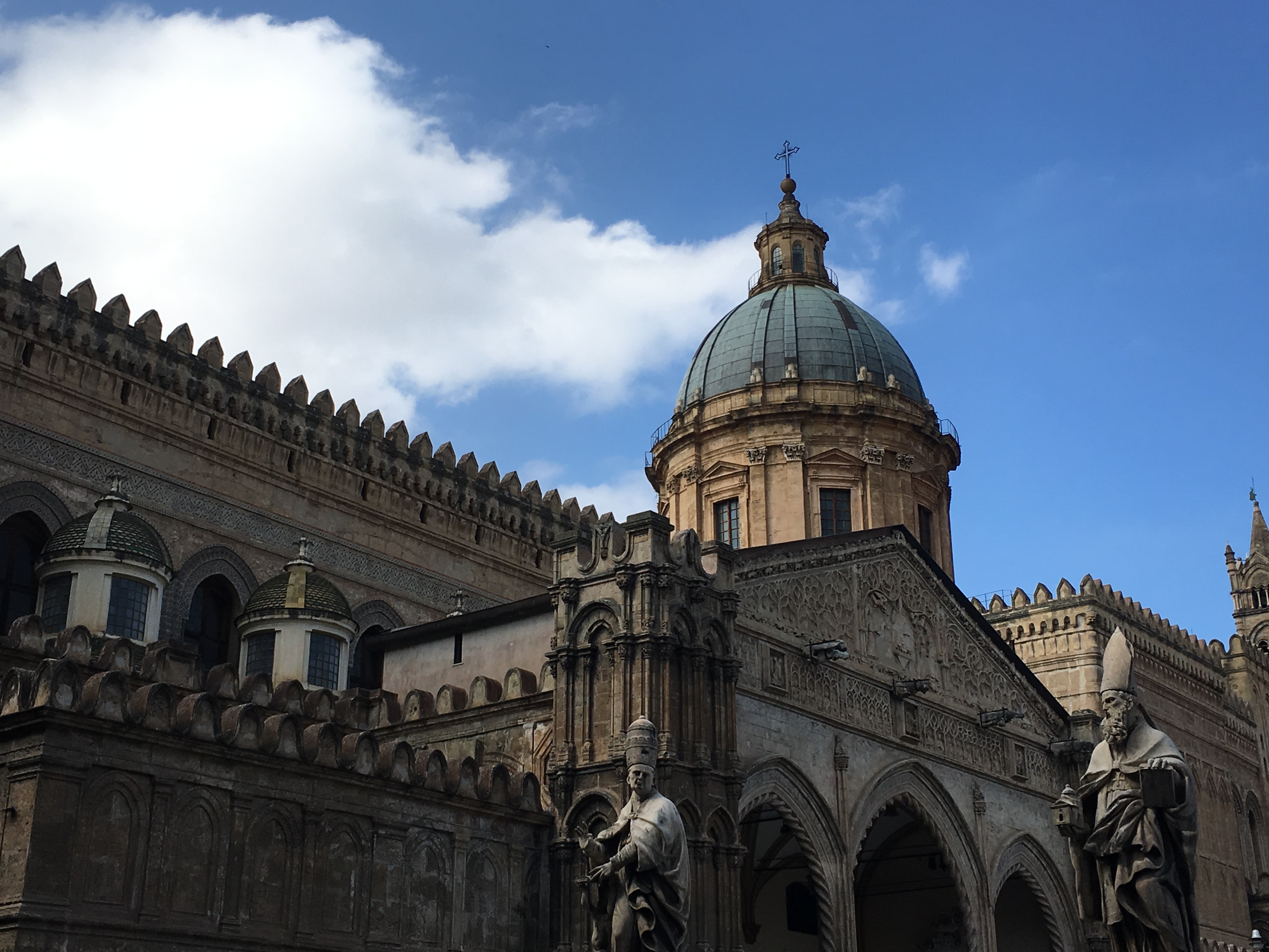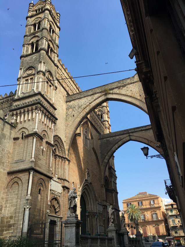Before leaving our country inn in Realmonte, we managed some relaxing pool time (and they serve cake for breakfast!) and the hour and a half drive to Palermo was absolutely gorgeous. We were on a freeway most of the way and I wasn’t expecting it to be beautiful, but it was. Mountainous and hilly and fieldy and at times oceany. If the Vicar of Dibley had a Sicilian cousin, the aerial views of at the opening of her show would have been filmed there. Unfortunately we were driving fast and didn’t take time to stop for photos. But it was stunning.