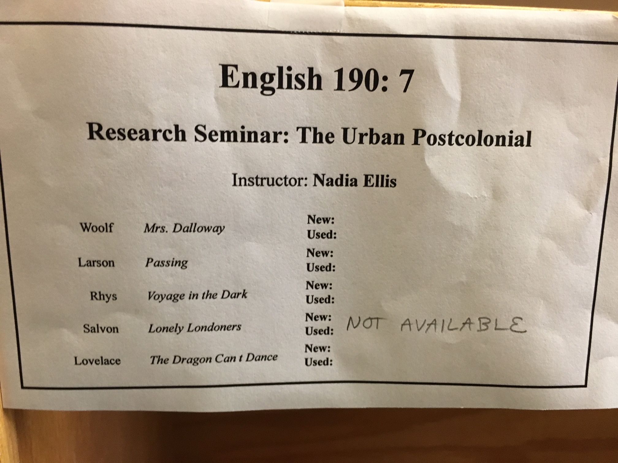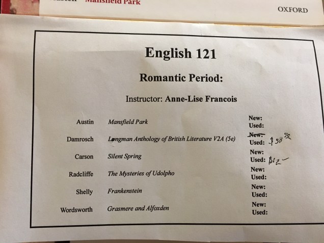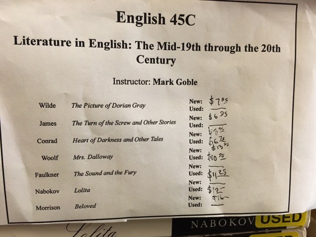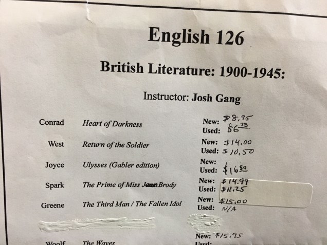 I’m glad the instructor dropped The Mill on the Floss in favor of Daniel Deronda since I’ve read the former but not the latter. But I wonder if I could actually get through Bleak House. Is that the one with Jarndyce and Jarndyce? But more than anything I’d be curious to see how it all fits in with Darwin. Or is it the other way around?Although I find Mrs. Dalloway dull as dishwater, I loved Passing and am curious about the “not available” Lonely Londoners.Huge fan of Americanah, couldn’t get into Homegoing, but would probably be interesting to talk about in class.I think I would probably hate this class. A lot.Oh lord. Maybe if I took this class and got to go in depth (and maybe got some help in understanding them) I would hate Faulkner and Conrad less; appreciate James and Woolf more, and finally get around to Beloved. Nabokov and Wilde would be re-reads, but then again, so would the James, Woolf, and Conrad. I would really have hated this as an undergrad.My writing classes in college were freshman comp and then writing for the social sciences. I have no idea how this class would work.This one looks a bit fascinating despite my general dislike of Robinson.People on Twitter have been reading, hating, and not finishing The Mysteries of Udolpho so that doesn’t bode well for this class. I’m very curious how Silent Spring fits in. (And yes, Austen, is spelled incorrectly.)With the exception of the text penciled in at the bottom, I’ve already read all of these. That would be the best of all worlds, re-reading 3 short books and then going in deep.Despite my dislike of Conrad and my fear of Ulysses, this would probably be the class I would take. But then again, maybe not. Probably more interesting to go a little further outside my comfort zone.At least three courses had Fun Home as assigned reading.