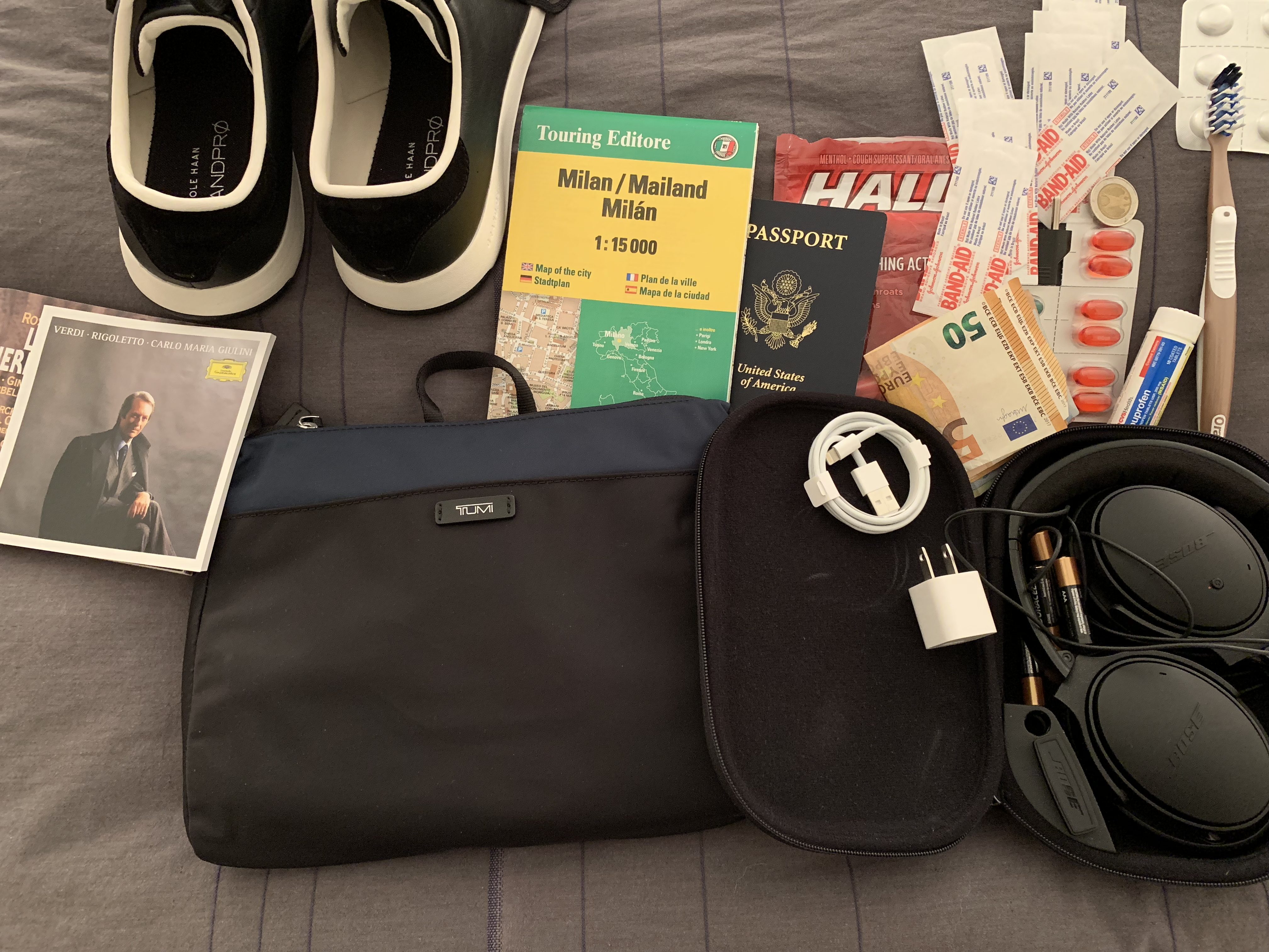Allow me to dissect the photo: Libretti for Rigoletto and La Cenerentola; a collapsible tote bag that I planned to (and did) use to bring home new shoes; I didn’t have a cold but since I had tickets to four different performances, I didn’t want to be caught off guard without medicine and throat lozenges, I never want to be Mr. Coughy; I took two pair of shoes that were both new and was worried I might get blisters, but I didn’t need to use any of the Band-Aids.