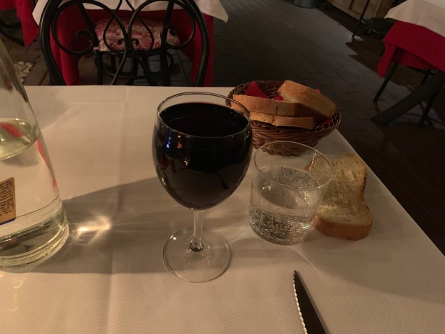 And on my first day of feeling fine, I went out for a meal that included some red sauce and a very full pour of wine.