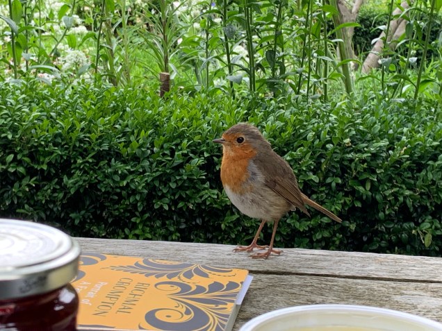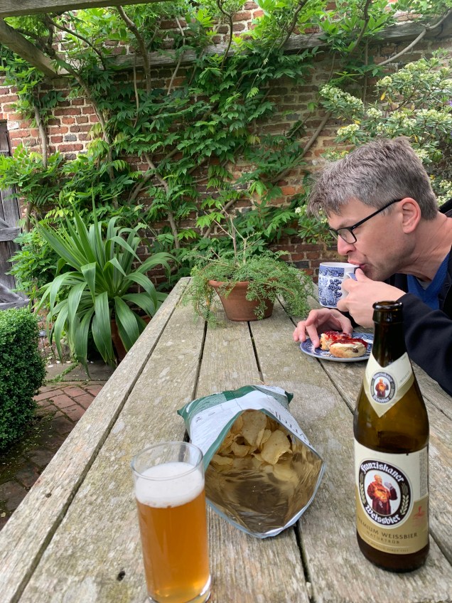 Absolutely perfect. If I do say so myself.At the cafe for this cuppa. I should say that I’m not much of a tea drinker, but when accompanying a scone, it kind of hits the spot.At 5:30 each night, after everyone else is gone, the living room door opens out onto the White Garden, we emerge, and it’s time for (late) afternoon tea.Our table in the White Garden. After a few days John preferred beer and crisps over scones and tea.One evening this little guy came to visit.At the end of the trip, the scones in the BA business class lounge were pretty awful. The scone itself might have been okay, but the industrial strength strawberry jam was almost entirely without taste. Interestingly, the scone BA gave us on the plane was delicious.Not my last scone of the trip, but I couldn’t leave you with that substandard BA scone.