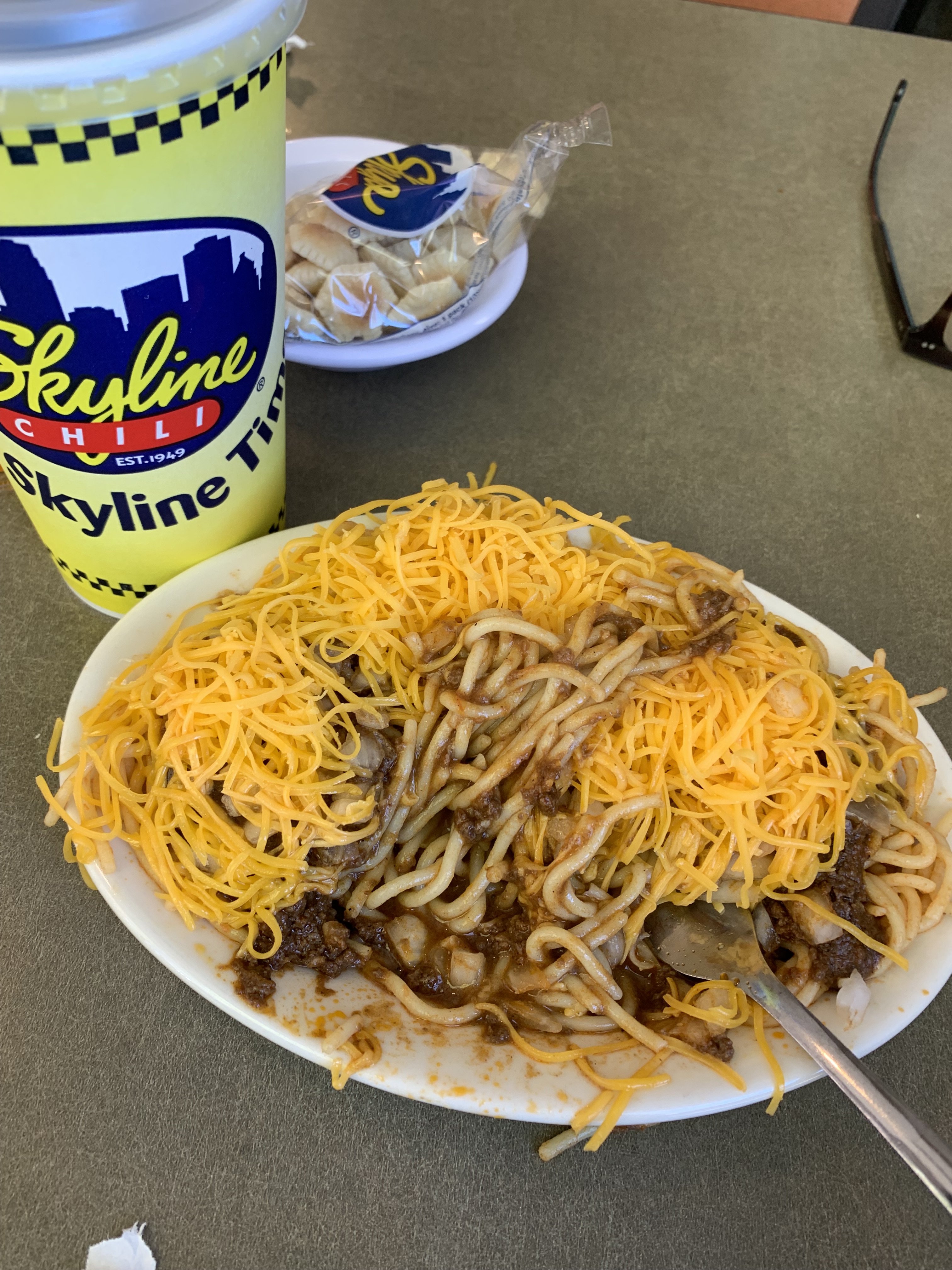 Cincinnati wasn’t all books (or music for that matter). I was wary of Cincinnati Chili, cinammon doesn’t seem like something that should be in chili. But prior to my trip I did some research on food I should eat while I was in Cincy and read a bit about this dish. It’s seasoning comes out of a Greek tradition and doesn’t really have much (or anything?) to do with the chili that the rest of us know. So, thinking of it that way, I decided to give it a go, and I really liked it. In fact I had it again the next day. And now, about a week later, I would love another plate of it.