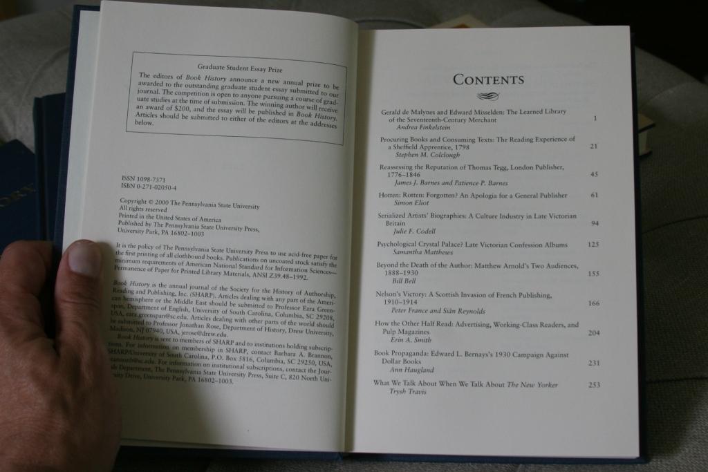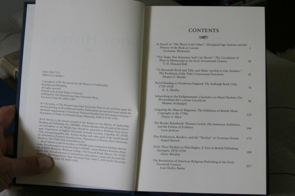 | I know my audience. You want to know the contents of the three volumes of Book History. Volume 1 (Click on any photo to make it larger) |