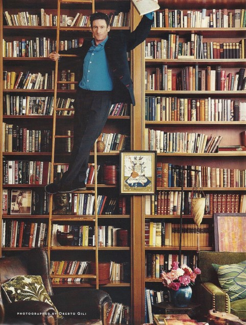 Is this person a reader? Probably, but a few things make me think maybe not as big a reader as one would think at first glance. First, these are definitely catch-all shelves. Old French grammar books, guide book to colleges, Folio Society editions and some pretty sets that seem like they may have been purchased to fill some space. Plus a smattering of anthologies and other books that one typically gets in college days. On the other hand the general disorganization suggests that the books are being read rather than arranged for effect. I think this person does read, but doesn’t necessarily have very defined tastes. Do we think the guy on the ladder is the guy who does the reading in the house?