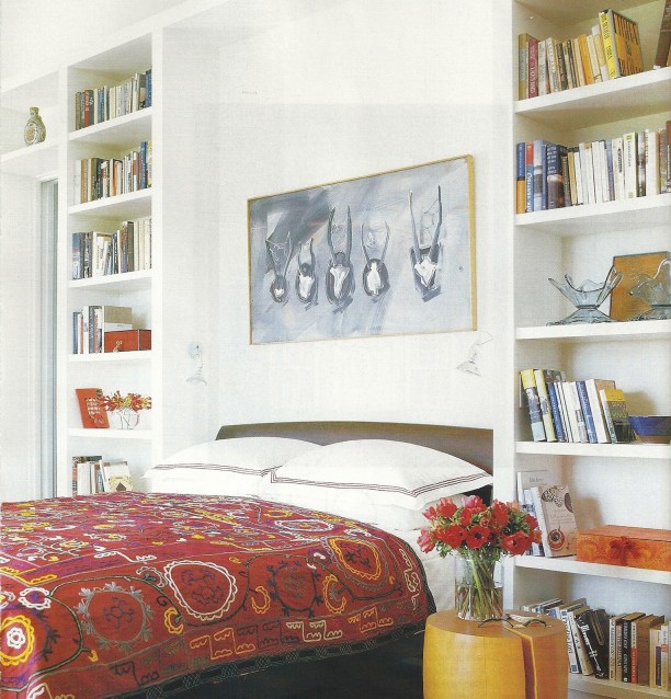 The Books: Like many of the library photos in interior design magazines, this one has lots of art books. But in this case they seem to evince an intellectual interest in art rather than just a decorative one. But speaking of intellectual, the fiction that I have been able to recognize with the help of my magnifying glass suggests that the owner of this library sticks to literature with a capital L. A couple DH Lawrence, Primo Levi, Gabriel Garcia Marquez, James Joyce, Vaclav Havel, TS Eliot, Milan Kundera, etc.