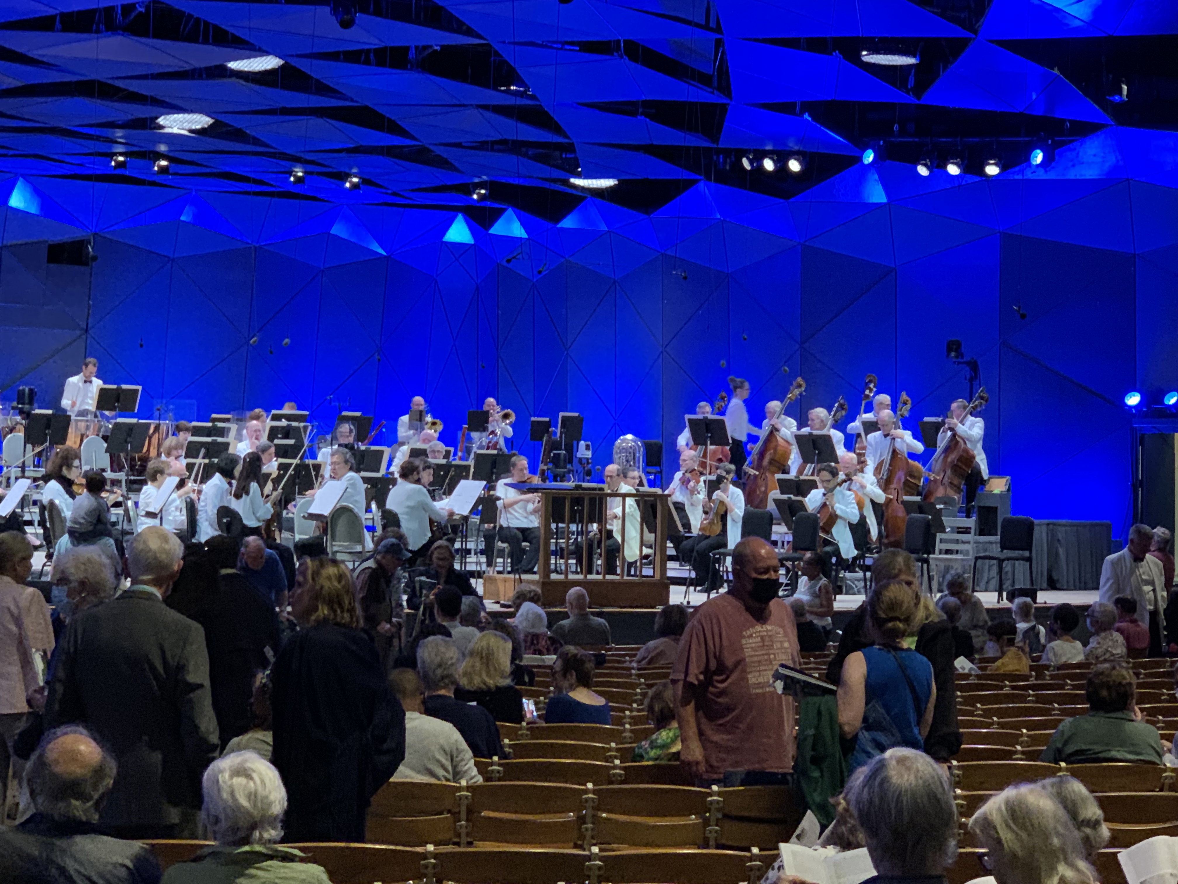 No, the audience isn’t ignoring the BSO. This was before the concert with some in the orchestra warming up. The Shed was at about 50% capacity because of Covid. This was kind of fabulous because it meant we had lots of room to spread out, but it also meant that a father and daughter were too far away to be effectively shushed as they talked endessly during the music.