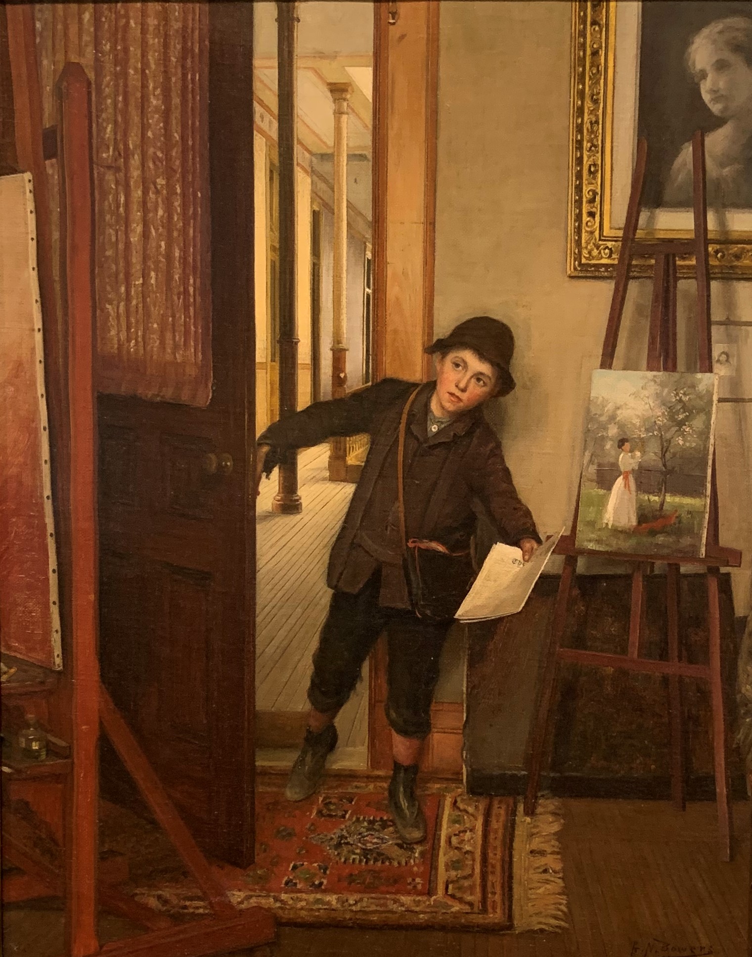 The Newsboy (1889) George Newell Bowers The subject is a little too “Newsies” for me to covet this one for my own walls, but I love all the background detail. I’m particularly taken with the glimpse of the hallway. As a historic preservationist by training, it is fascinating to see the vernacular detail in what is a rather simple, but probably fancy for where and what it was, hallway. Paintings of this period are more often filled with images of rooms like the one in the foreground, but not the circulation space beyond. Photos from the time similarly tend to overlook documenting something as mundane as a hallway, and even if they do, we don’t get to see them rendered in color like this.