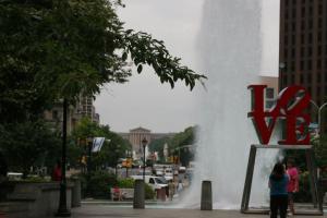 Robert Indiana’s Love sculpture looking up the boulevard toward the Philadelphia Musuem of Art.