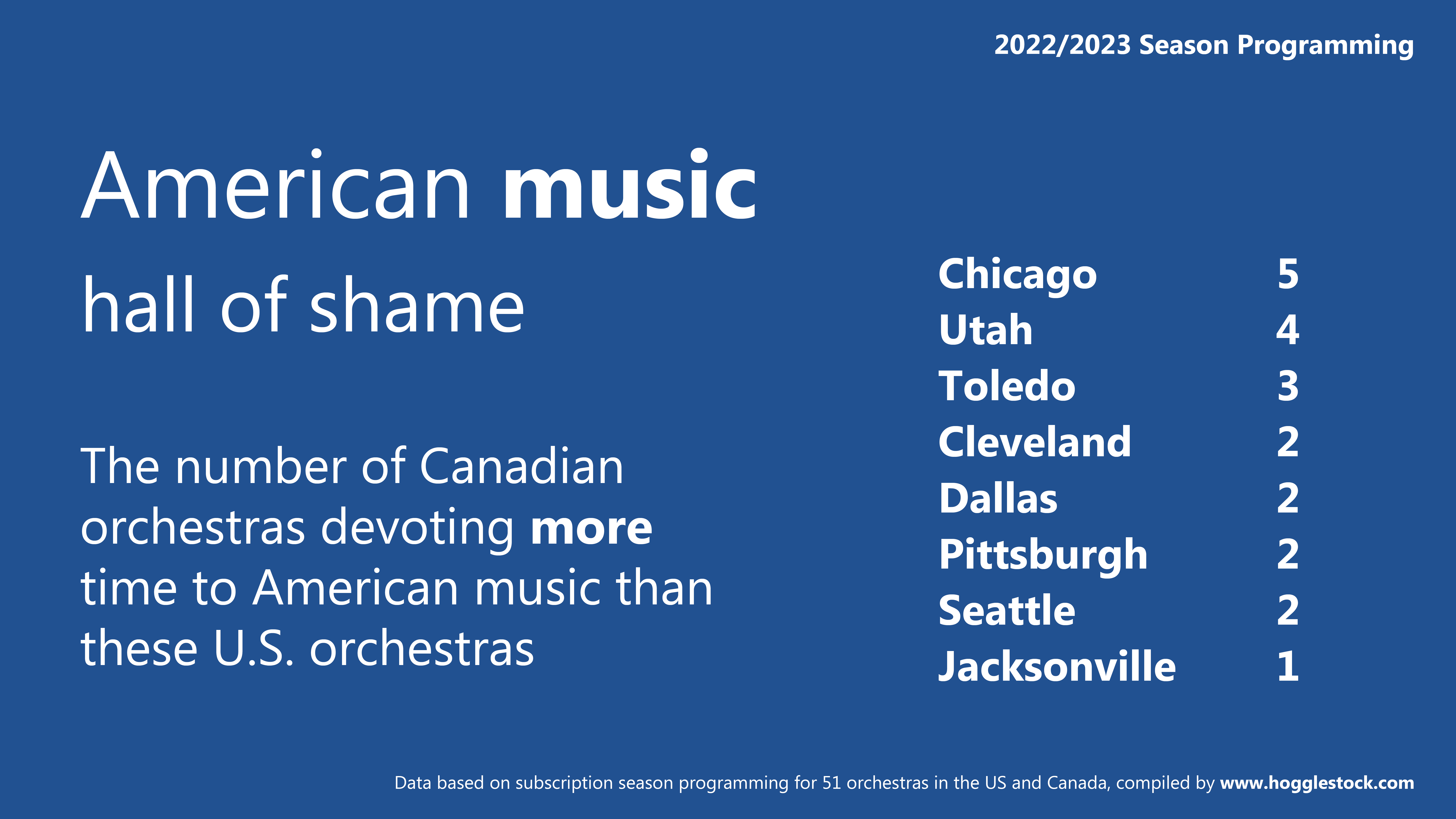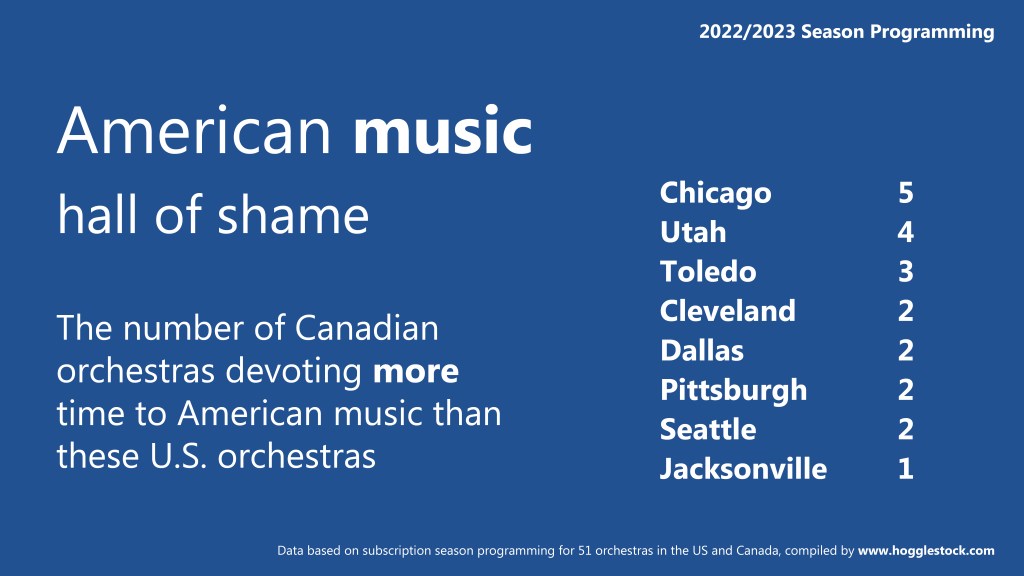 And this is no more evident than in the hall of shame. These fine orchestras are devoting less of their seasons to U.S. American composers than the Canadians. What’s up with that?