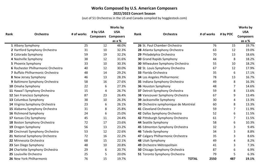 Sigh. Along with works by BIPOC composers and women composers, the percentage of programming devoted to U.S. composers also declined from 21/22 to 22/23. Last season it was 23% of all programming. Just by looking at the top 20 orchestras, you sure can’t blame the expanded data pool, given that 15 of the top 20 are smaller bands that weren’t part of last years list, and, as you will see further down this post, some of the big guys failed in a really spectacular way.