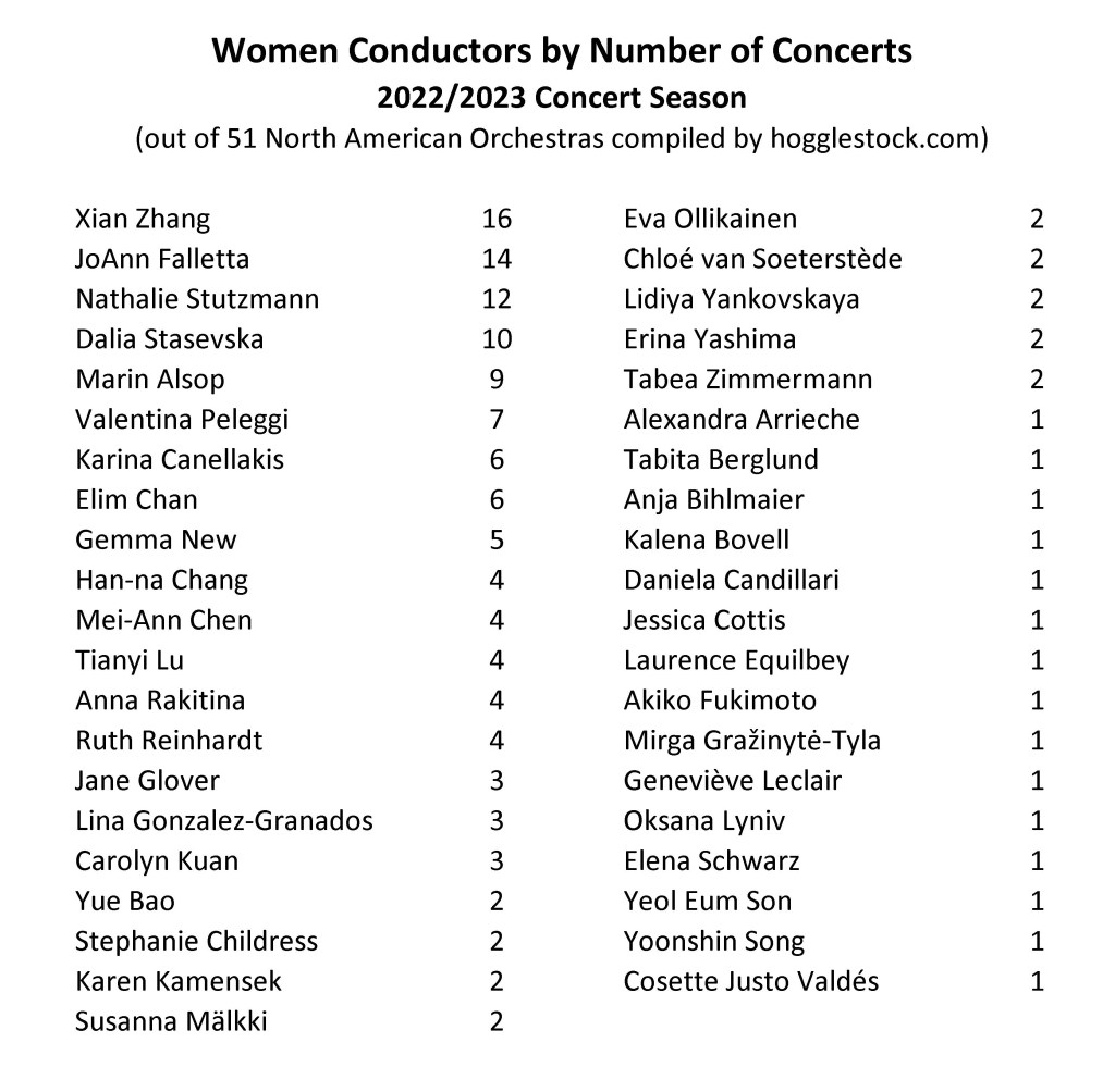 As Music Director of the New Jersey Symphony, it is no surprise that Xian Zhang tops this list, but what is more encouraging is that five of her dates are guest conducting for other orchestras (Chicago, Los Angeles, San Francisco, Seattle, and St. Louis).