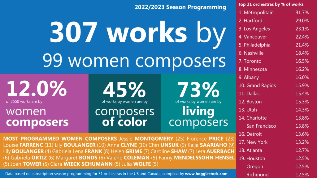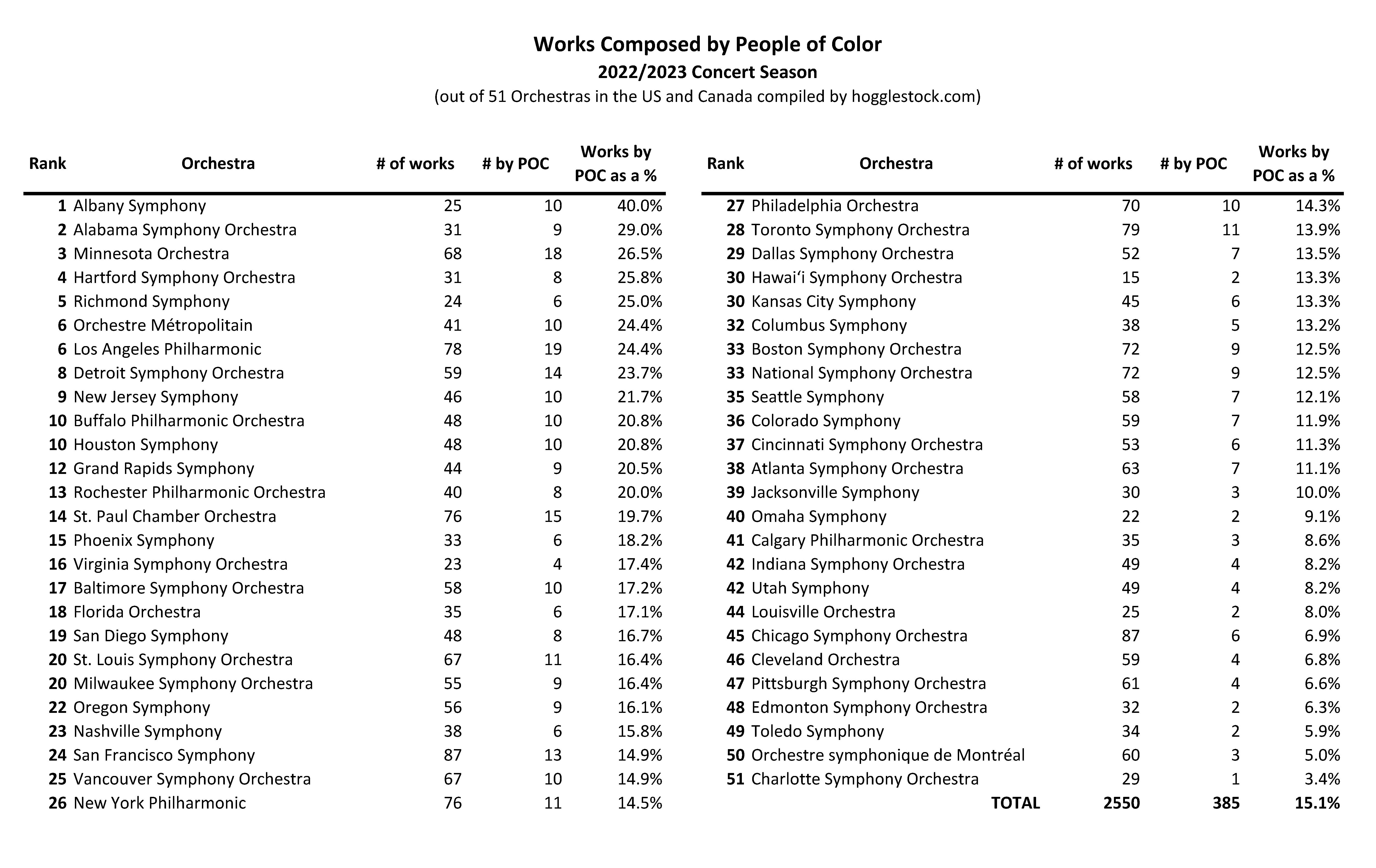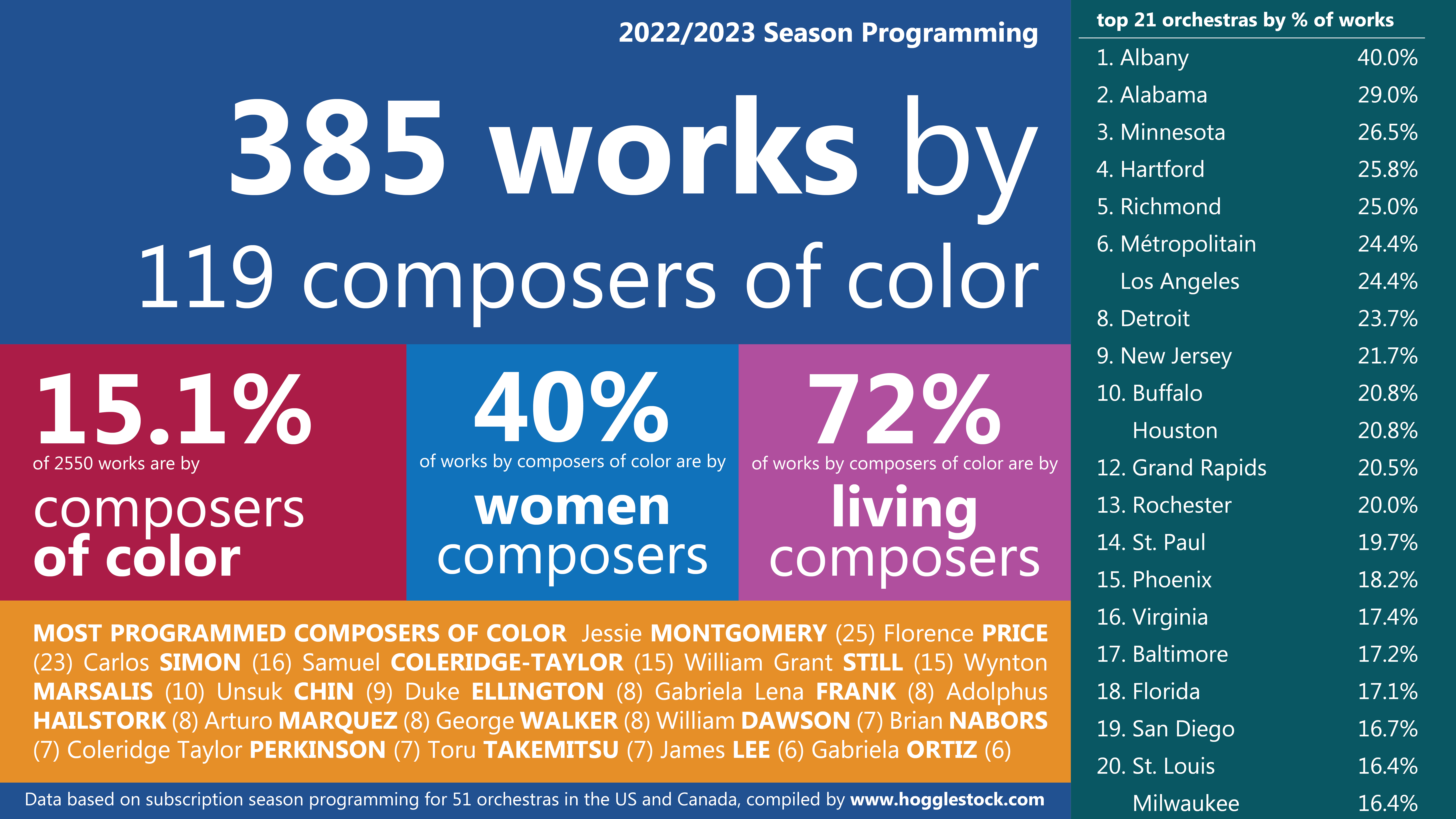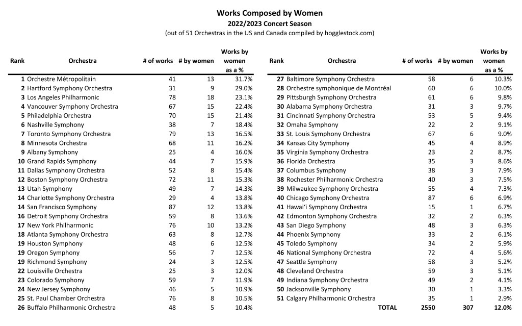 Along with my analysis last year, came the not-too-surprising result that there is a distinct lack of variety and diversity when it comes to programming. So this year I expanded my list to 51 orchestras in North America.