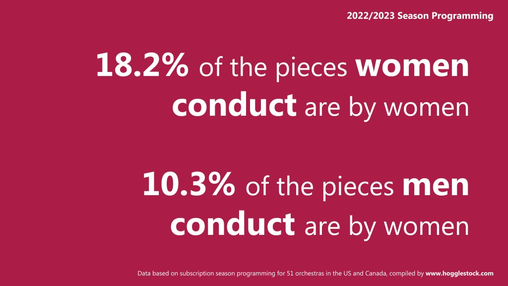 A note about the St. Paul Chamber Orchestra, they typically don’t have a conductor and they have artistic partners rather than a music director. As it stands, about eight of their concerts have a discernable conductor and three of those are women.