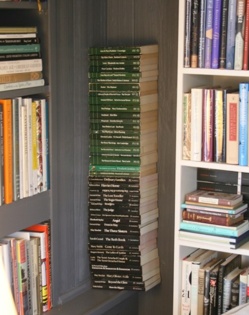 As usual, I have an ongoing internal struggle with trying to develop an acquistion and rentention policy that will satisfy my bookmania while recognizing a finite amount of shelf space. (Although I should note that John indicated for the first time that shelves of books might be tolerated in other parts of the house…) My biggest problem is trying to determine which books I want to keep. As far as fiction goes my tendency is to want to keep harder to find novels even if they aren’t a favorite. I hate the thought of less than popular novels being lost in the mists of time. Sometimes I feel like I am running a one-person seed bank, except instead of heirloom seeds I am banking obscure, unloved books otherwise destined to be pulped. The problem with this approach is that one’s library can become clogged with books that don’t necessarily represent one’s reading tastes and many of the covers look pretty ratty on the shelves. And then there are those books that I keep around just to prove that I have diverse reading tastes. If I didn’t keep these one offs I would have a library filled only with prolific favorites like Atwood, Anita Brookner, Sinclair Lewis, Iris Murdoch, Muriel Spark, etc. Those collected works can take up a lot of shelf space and crowd out any possibility for variety.